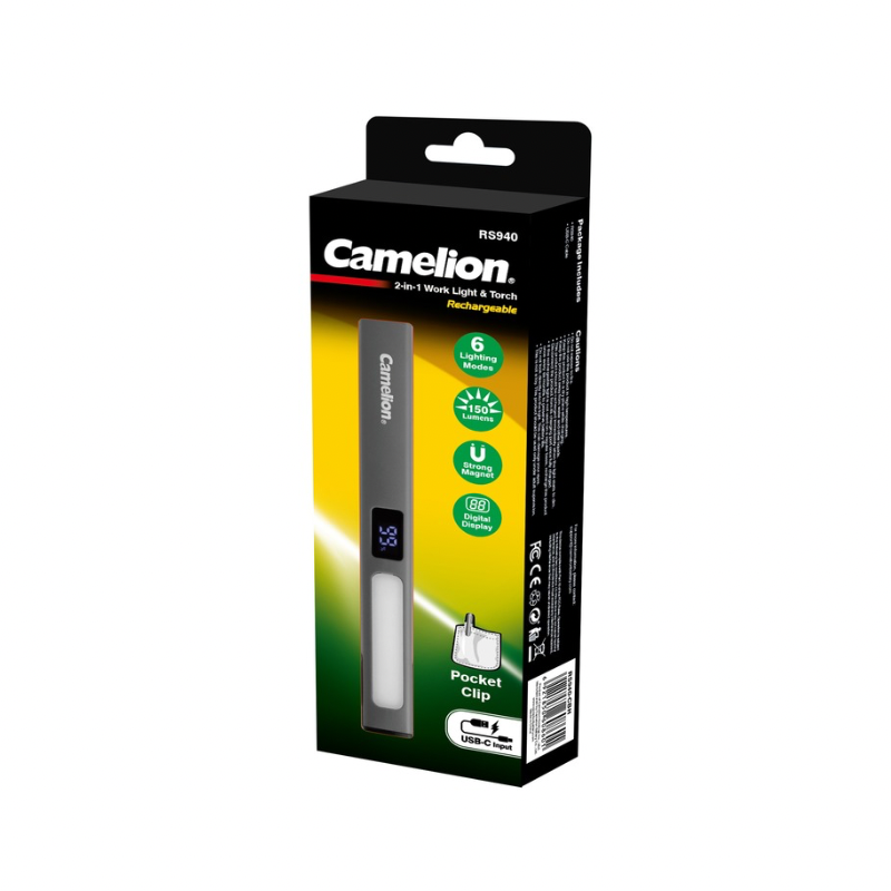 The Camelion RS940 is a compact, pen-shaped rechargeable light that functions as both a powerful torch and a hands-free work light. With six lighting modes, digital battery display, and a magnetic clip, it’s designed for professionals, DIYers, and outdoor enthusiasts who need bright, reliable light in any situation.
